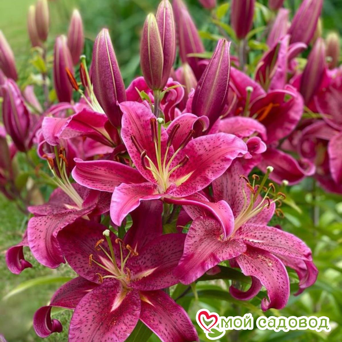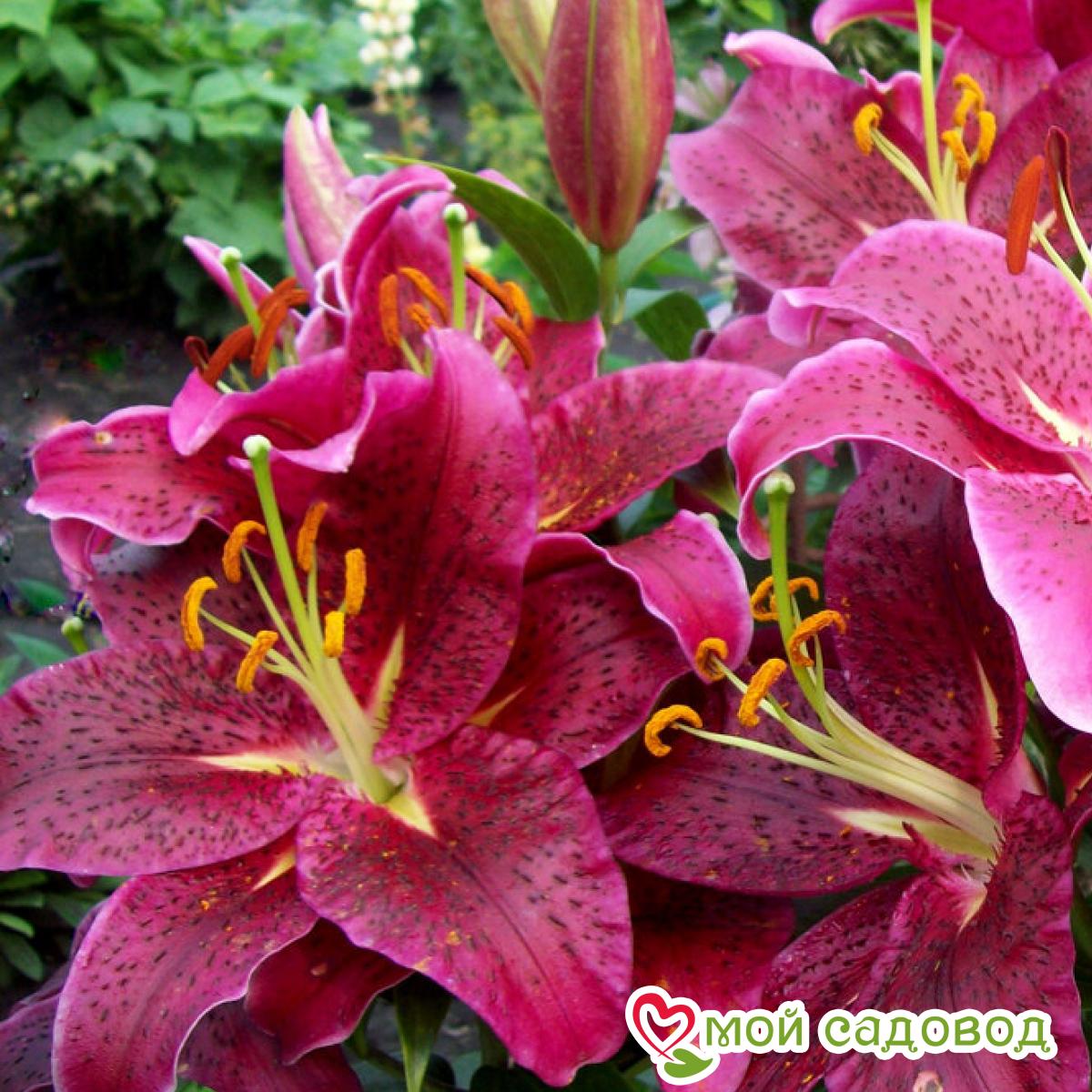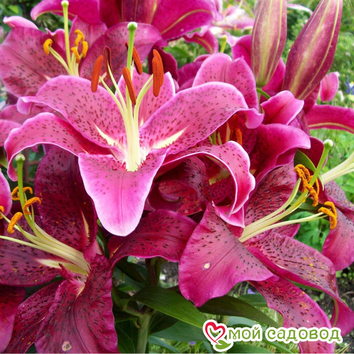 Цветки крупные, диаметром 25 см, ярко-красные, с переходом к пурпурному. Растут вверх и в сторону. Зацветает в июле-августе. Имеет приятный аромат. Высота растения 120 см. Уход за лилиями включает в себя прополки, поливы, рыхления, подкормки, борьбу с болезнями и вредителями. Поливают лилии в период цветения, поддерживая почву в увлажненном состоянии. Чтобы избежать пересыхания и перегрева почву мульчируют перегноем или торфом слоем в 5-6 см. Лилии хорошо отзываются на подкормки. Первую подкормку проводят весной после схода снега, разбрасывая по поверхности почвы азотные удобрения. Во время бутонизации растения поливают растворенной в воде аммиачной селитрой, непосредственно перед цветением использую фосфорно-калийные удобрения в жидком виде, в конце лета, но не позднее середины августа, лилии подкармливают фосфором и калием. Выращивать лилии на одном месте дольше 3-4 лет крайне нежелательно: луковица нарастает, становится рыхлой, растениям становится тесно по соседству. На 5 -6 год заметно снижается высота цветоноса, количество бутонов и значит, луковица истощена, а это может привести к заболеваниям и гибели растения. Осенью, когда надземная часть растения отмерла, стебель обрезают на высоте 15 см от поверхности почвы, гнездо выкапывают целиком, отделяют от материнской луковицы детки и высаживают их на доращивание. Саму материнскую луковицу пересаживают на новое место. В нашем интернет-магазине вы сможете купить Лилии Так же возможно вас заинтересуют Лилия-дерево Пурпл Принц и Лилия (ЛО-гибрид) Пинк Хевен